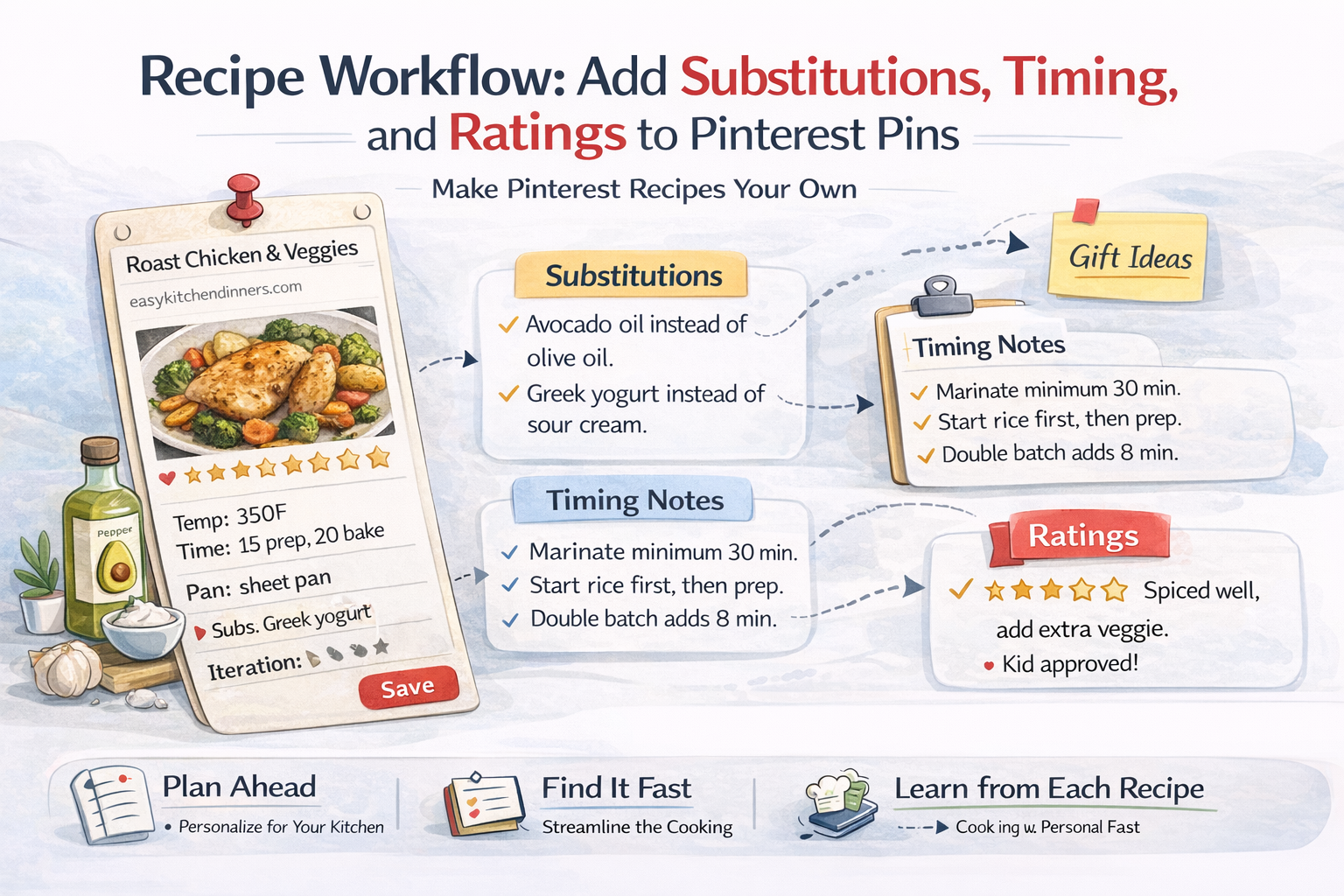 Recipe Workflow: Add Substitutions, Timing, and Ratings to Pinterest Pins